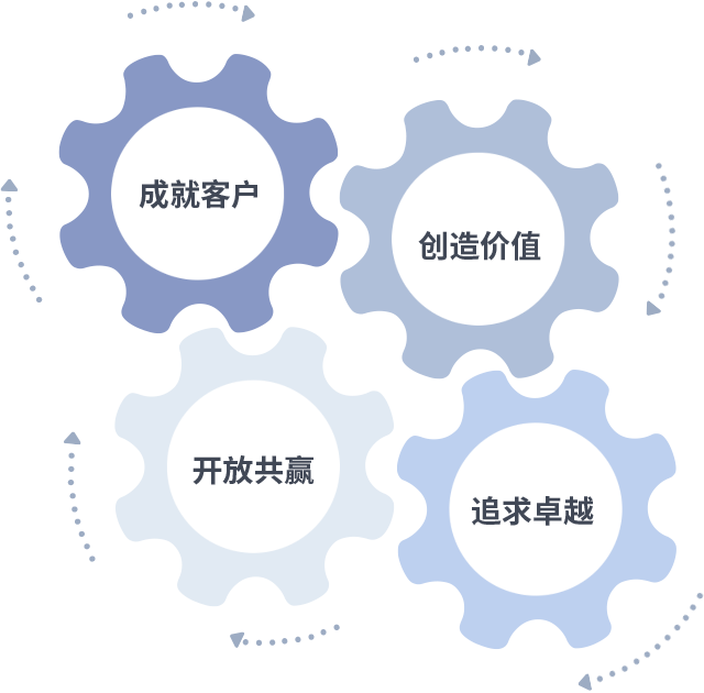 成就客户是一切决策的出发点,创造价值是衡量所有工作的标准,追求卓越是9599九五至尊做事做人的态度,开放共赢是9599九五至尊的格局也是最终的结果。价值观的齿轮环环相扣,推动着组织里的每个人不断向前。
